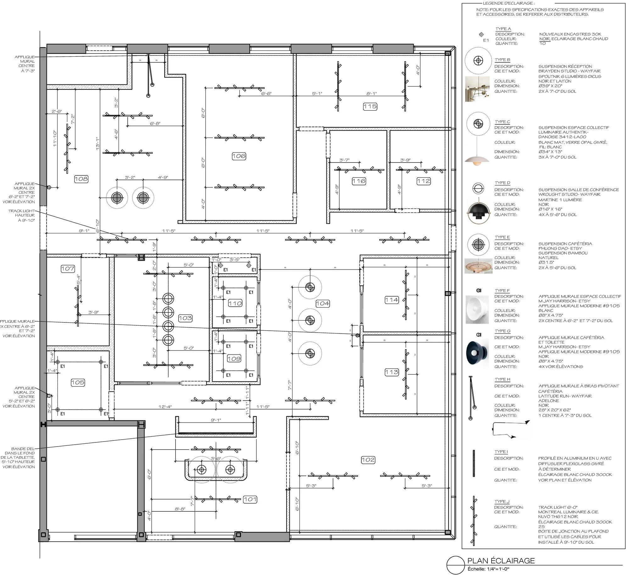 Plans électriques, rough de plomberie, plafond et éclairage