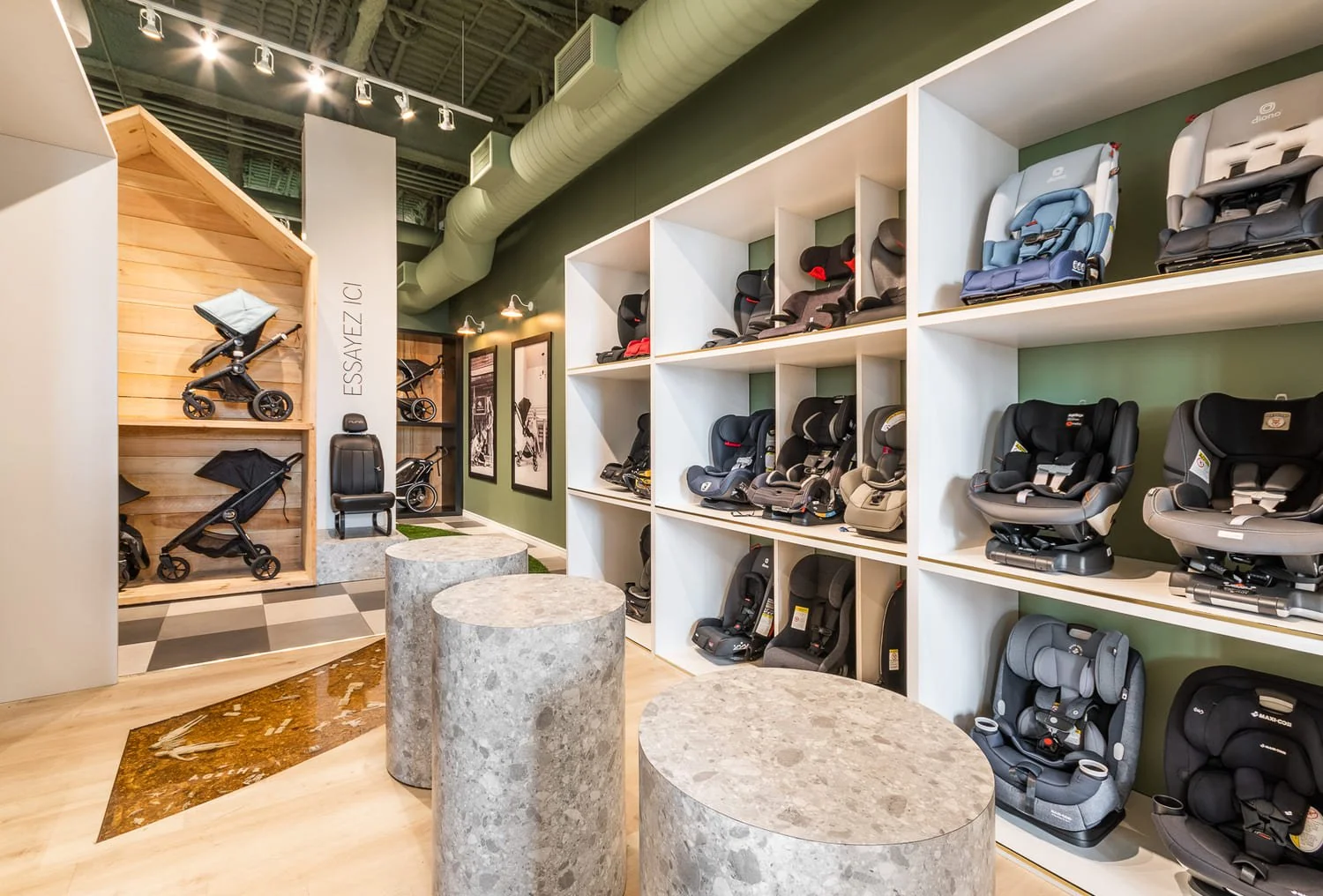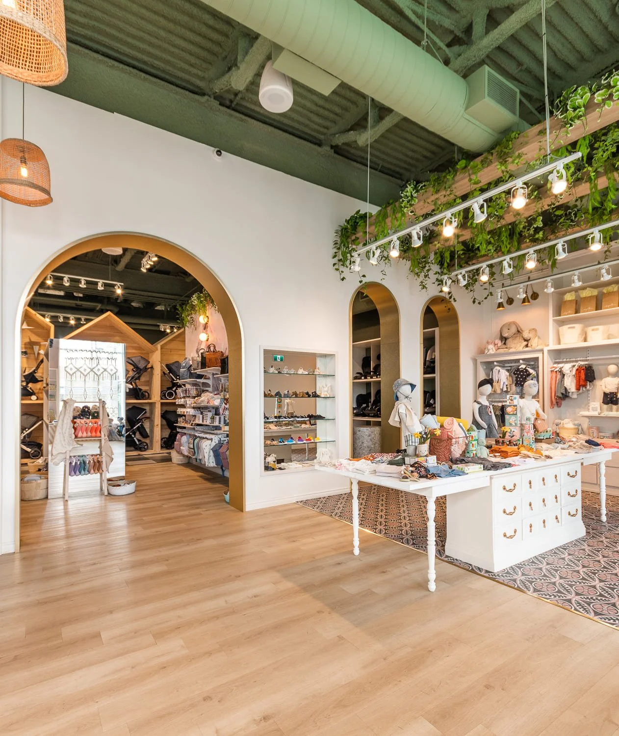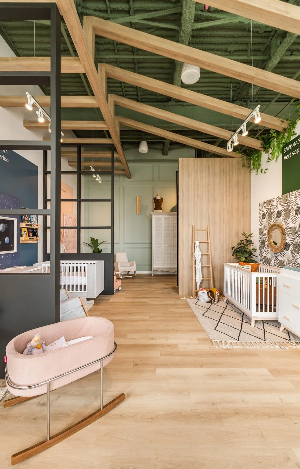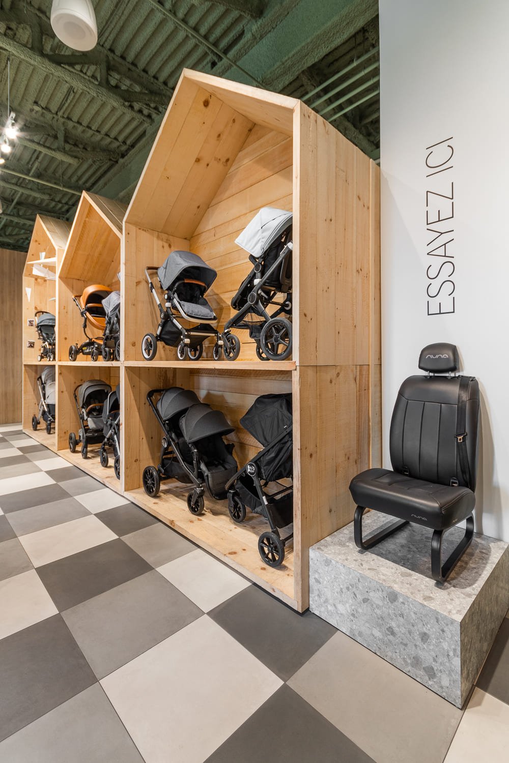 Le défi ? Concevoir un parcours client intuitif malgré la grande diversité de produits : mobilier de chambre de bébé, vêtements, poussettes, accessoires, soins, livres et jouets. Le zoning a donc joué un rôle clé dans la conception — chaque section a été pensée pour inviter à la découverte, tout en respectant une cohérence visuelle douce et intemporelle.