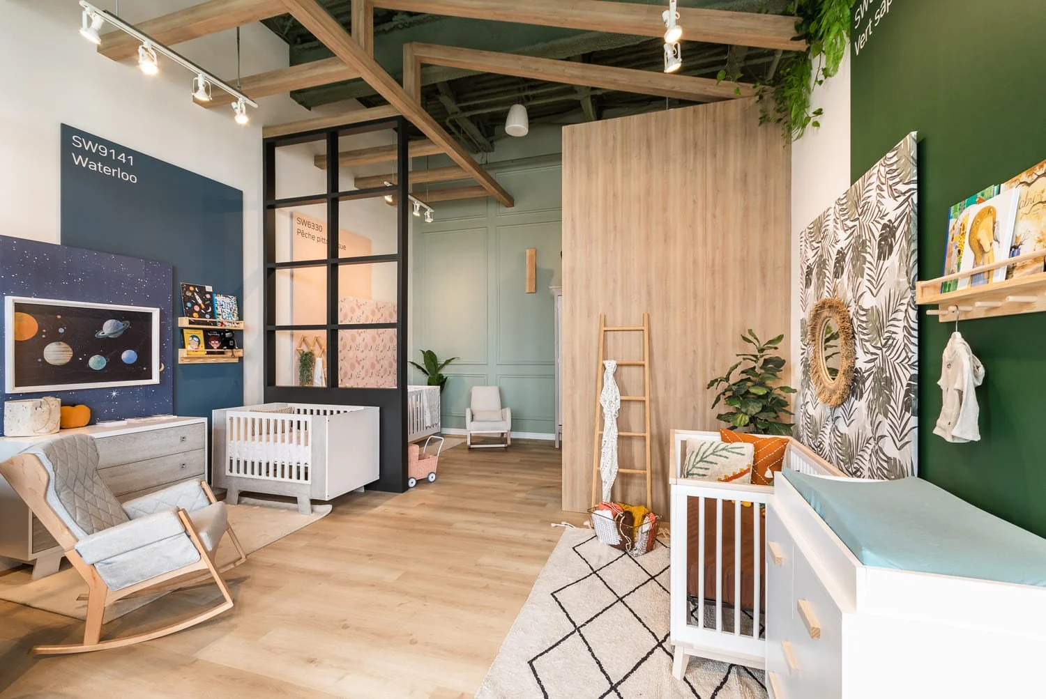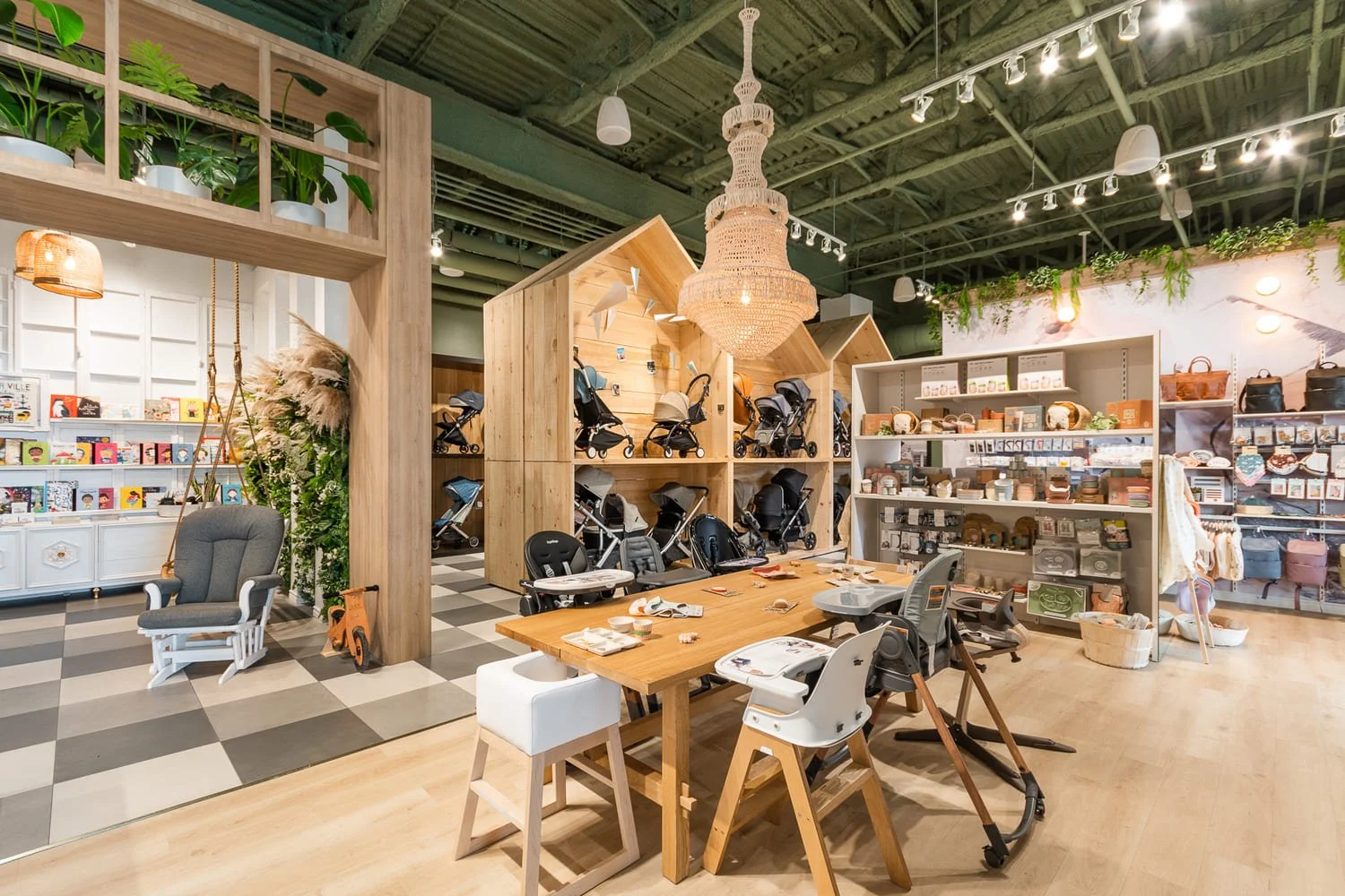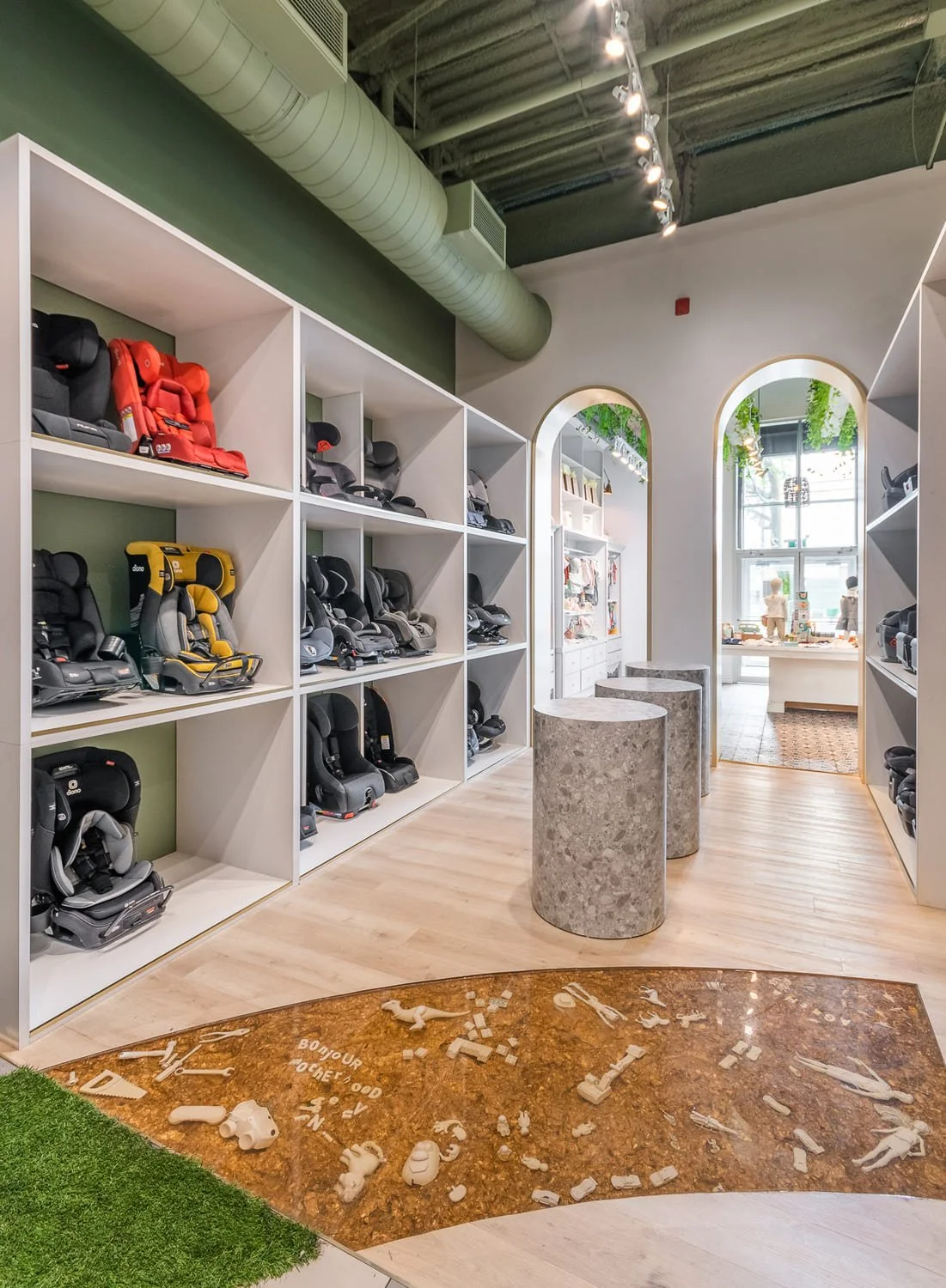 Le défi ? Concevoir un parcours client intuitif malgré la grande diversité de produits : mobilier de chambre de bébé, vêtements, poussettes, accessoires, soins, livres et jouets. Le zoning a donc joué un rôle clé dans la conception — chaque section a été pensée pour inviter à la découverte, tout en respectant une cohérence visuelle douce et intemporelle.