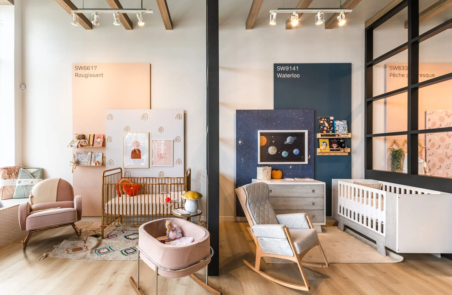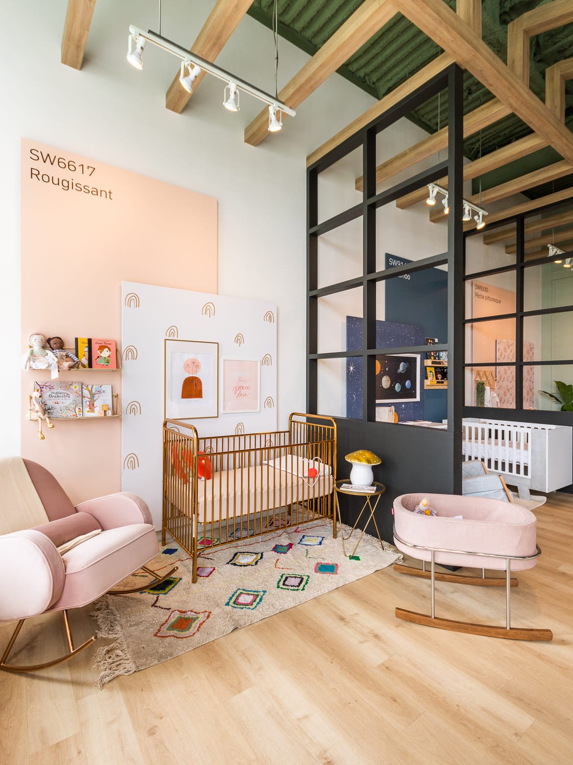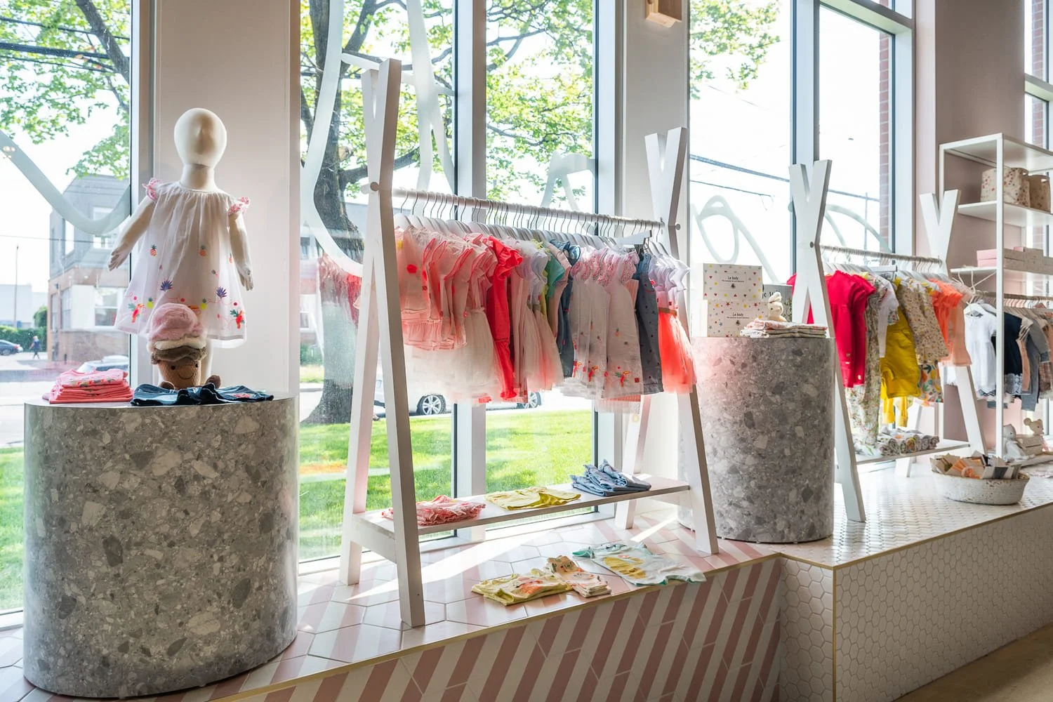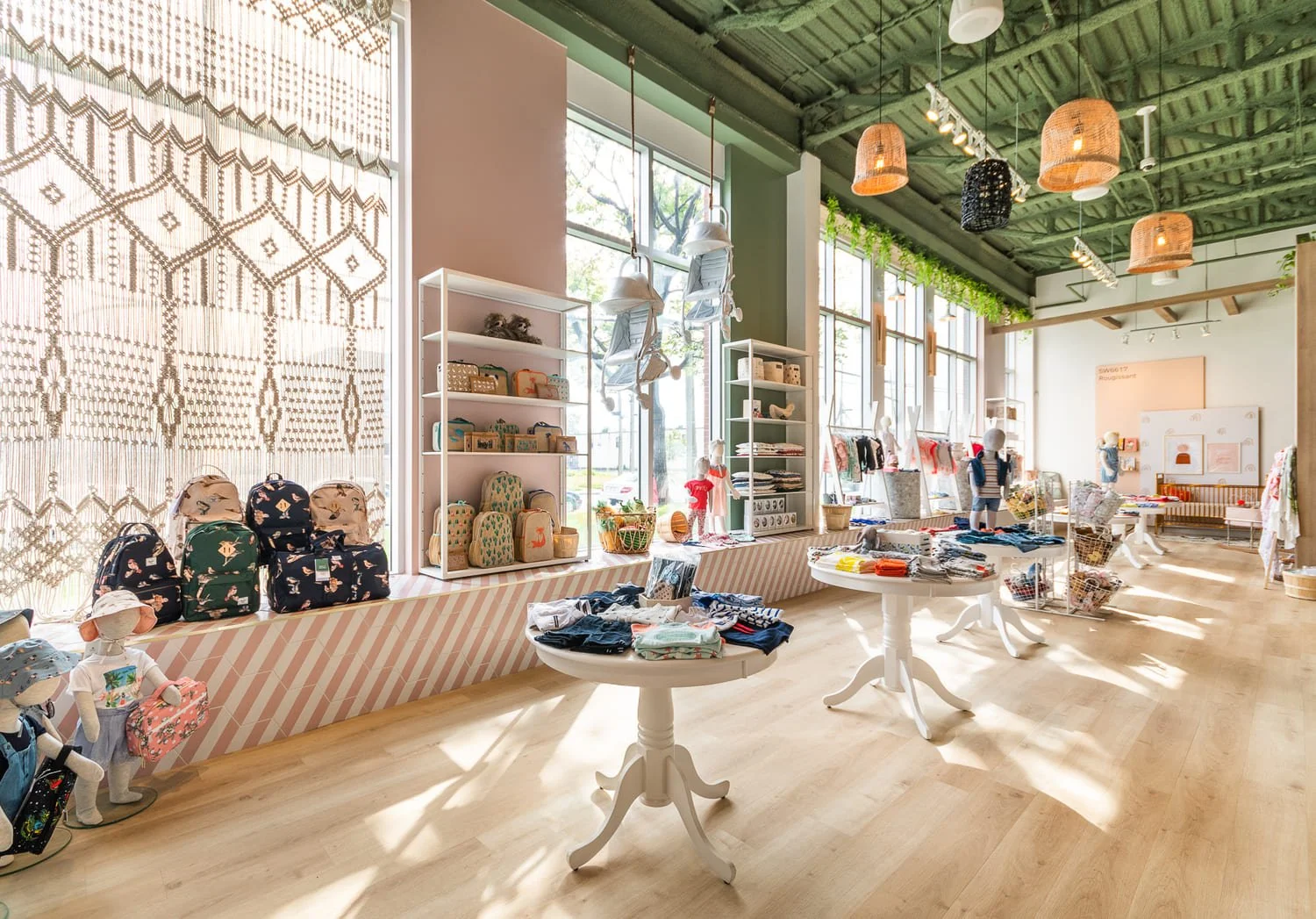 Le défi ? Concevoir un parcours client intuitif malgré la grande diversité de produits : mobilier de chambre de bébé, vêtements, poussettes, accessoires, soins, livres et jouets. Le zoning a donc joué un rôle clé dans la conception — chaque section a été pensée pour inviter à la découverte, tout en respectant une cohérence visuelle douce et intemporelle.