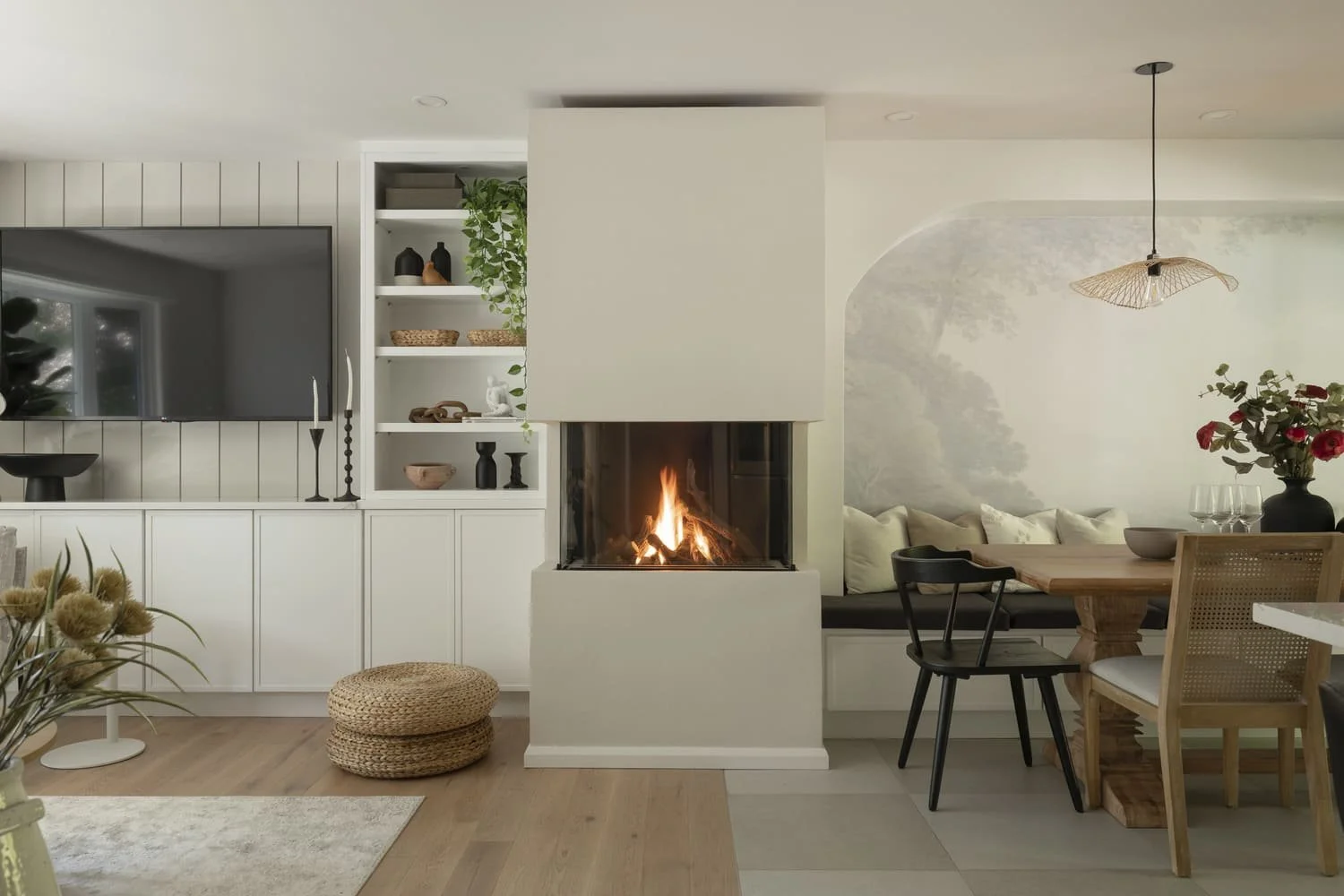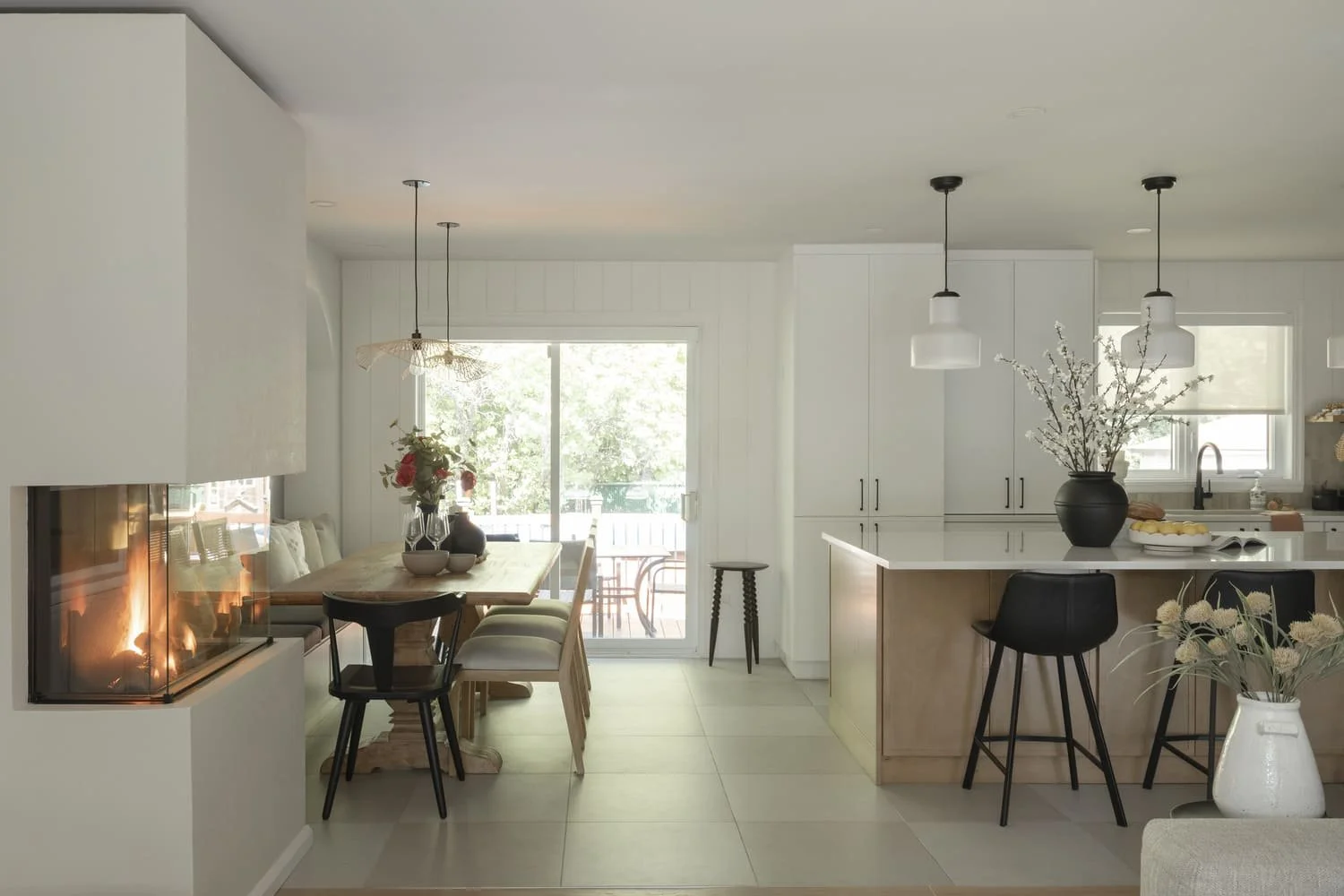 Nous avons repensé l’aménagement dans les moindres détails : une cuisine lumineuse au design épuré, ancrée dans des tonalités naturelles, où le bois clair côtoie les textures mates et les lignes sobres. Le foyer triple-face agit comme élément central, liant visuellement le salon et la salle à manger, tout en créant une ambiance feutrée et réconfortante.