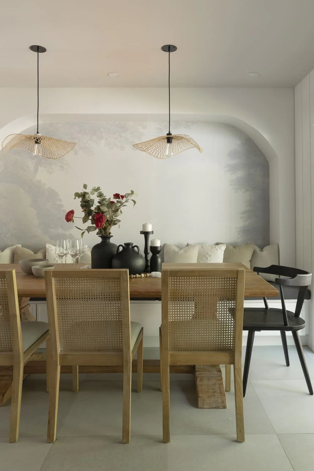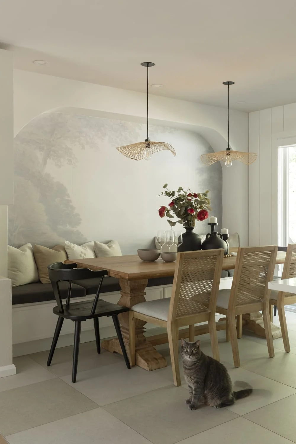Le coin banquette sur mesure adossé à une murale de paysage.