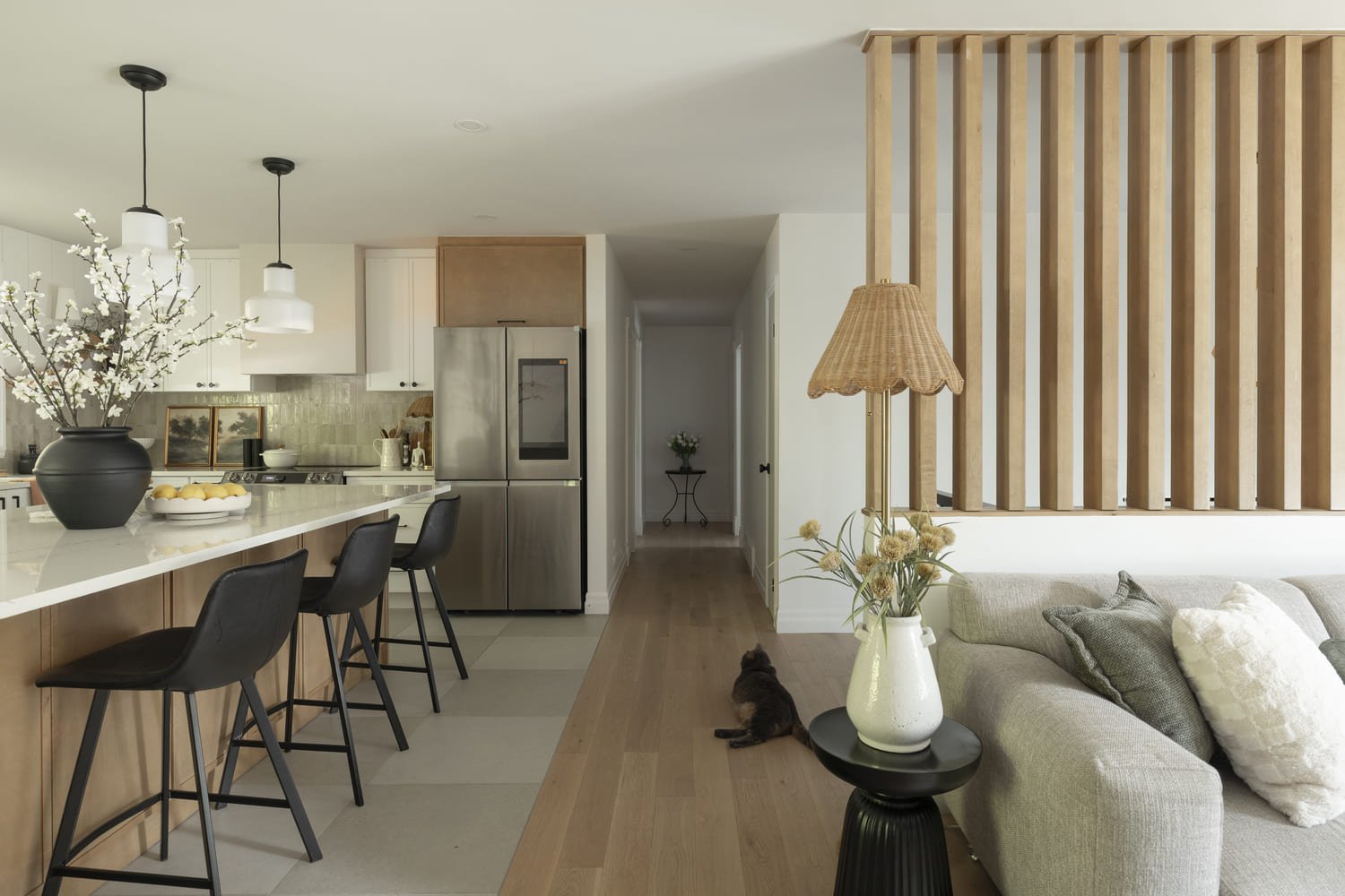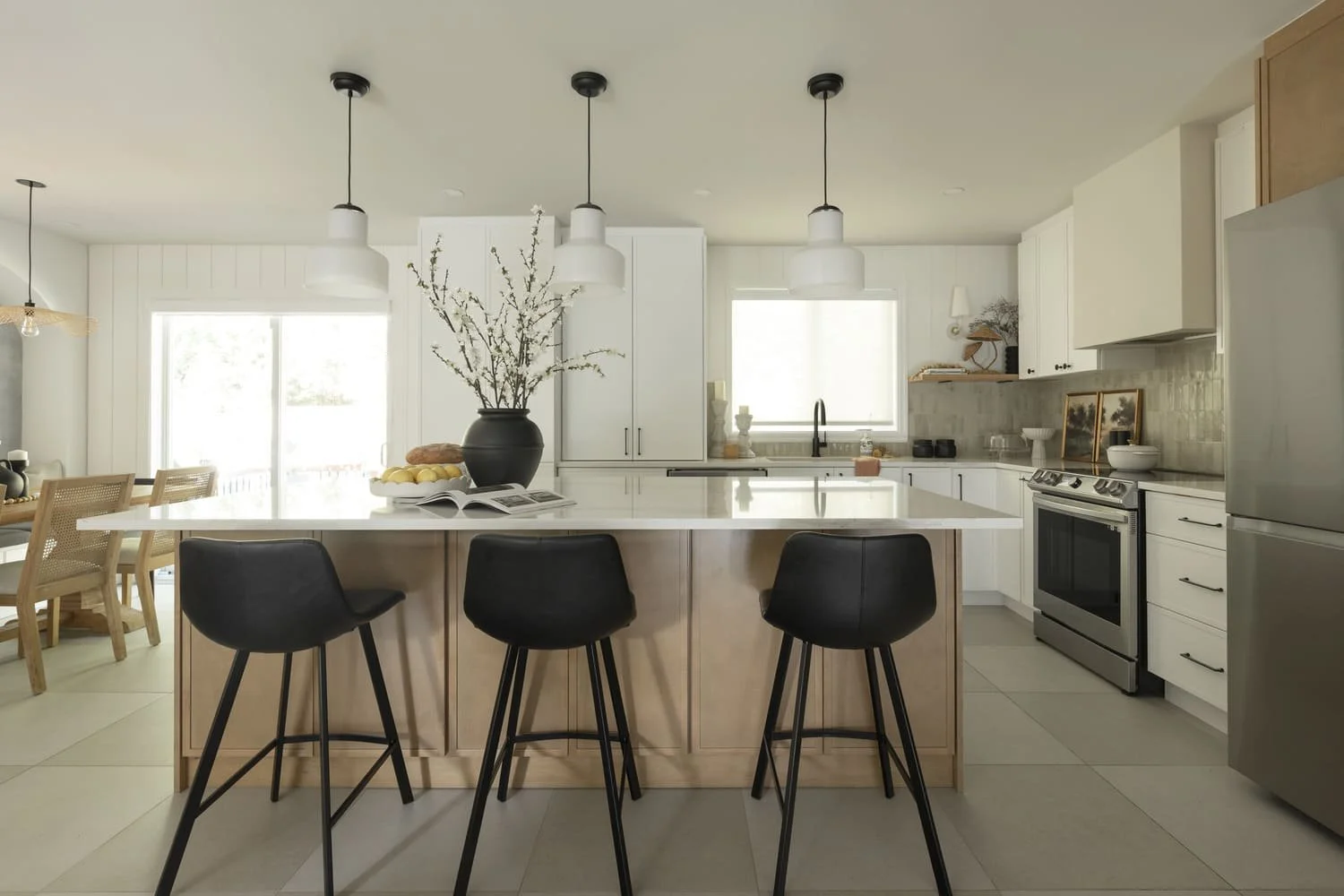 Dans cette rénovation résidentielle complète, nos clients souhaitaient transformer leur bungalow de style split-level en un espace de vie contemporain et ouvert, à l’image de leur quotidien actif avec un jeune enfant (et un chat bien curieux !).