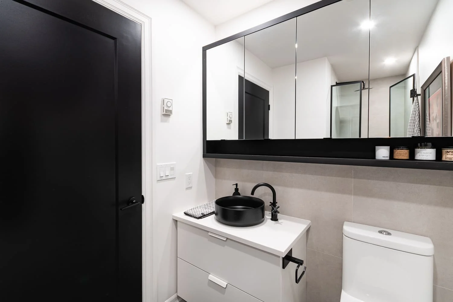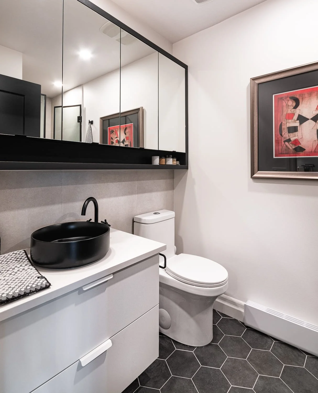 La salle de bain principale : rangement maximisé, combinaison réussie de la matérialité pour une pièce sans fenestration.
