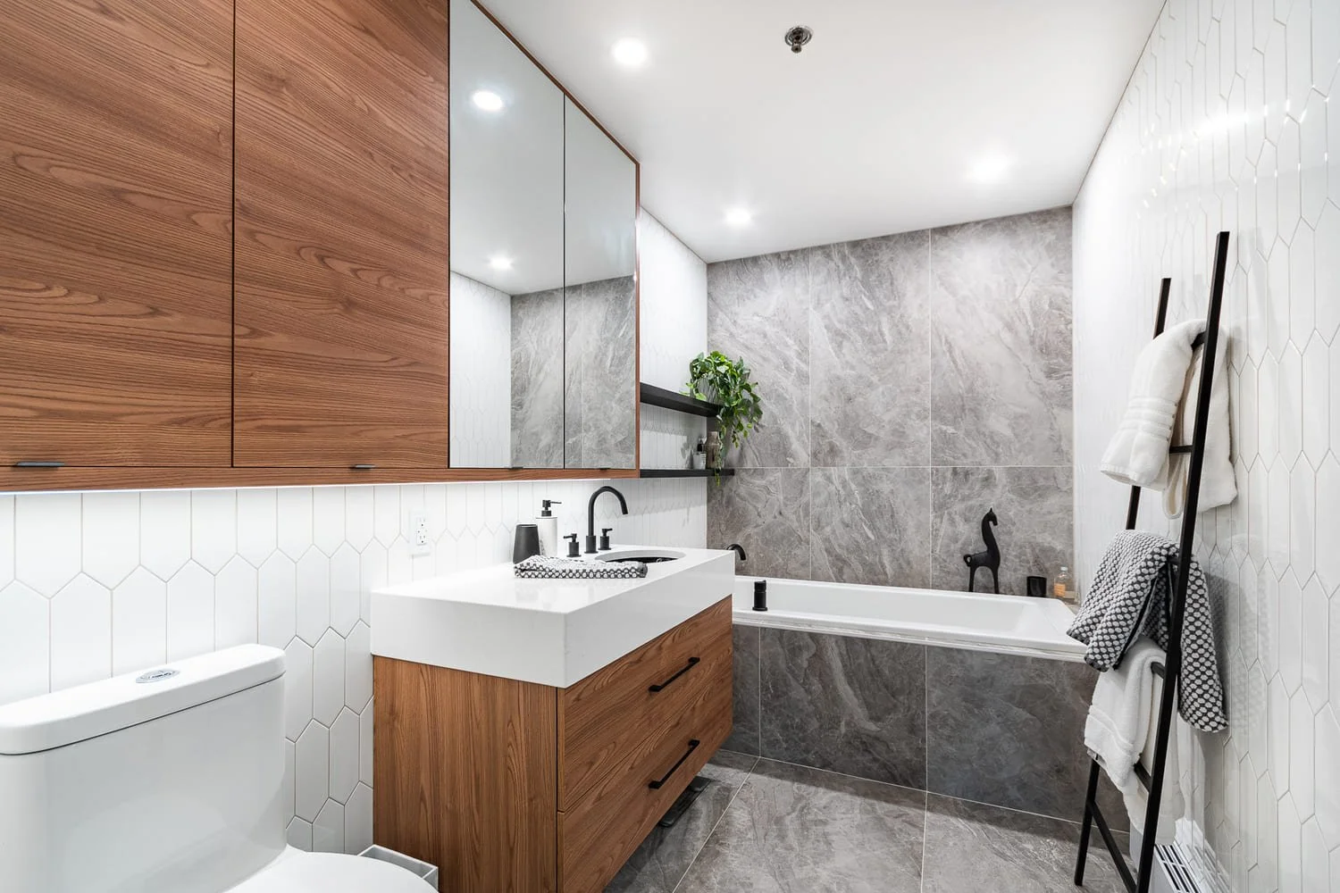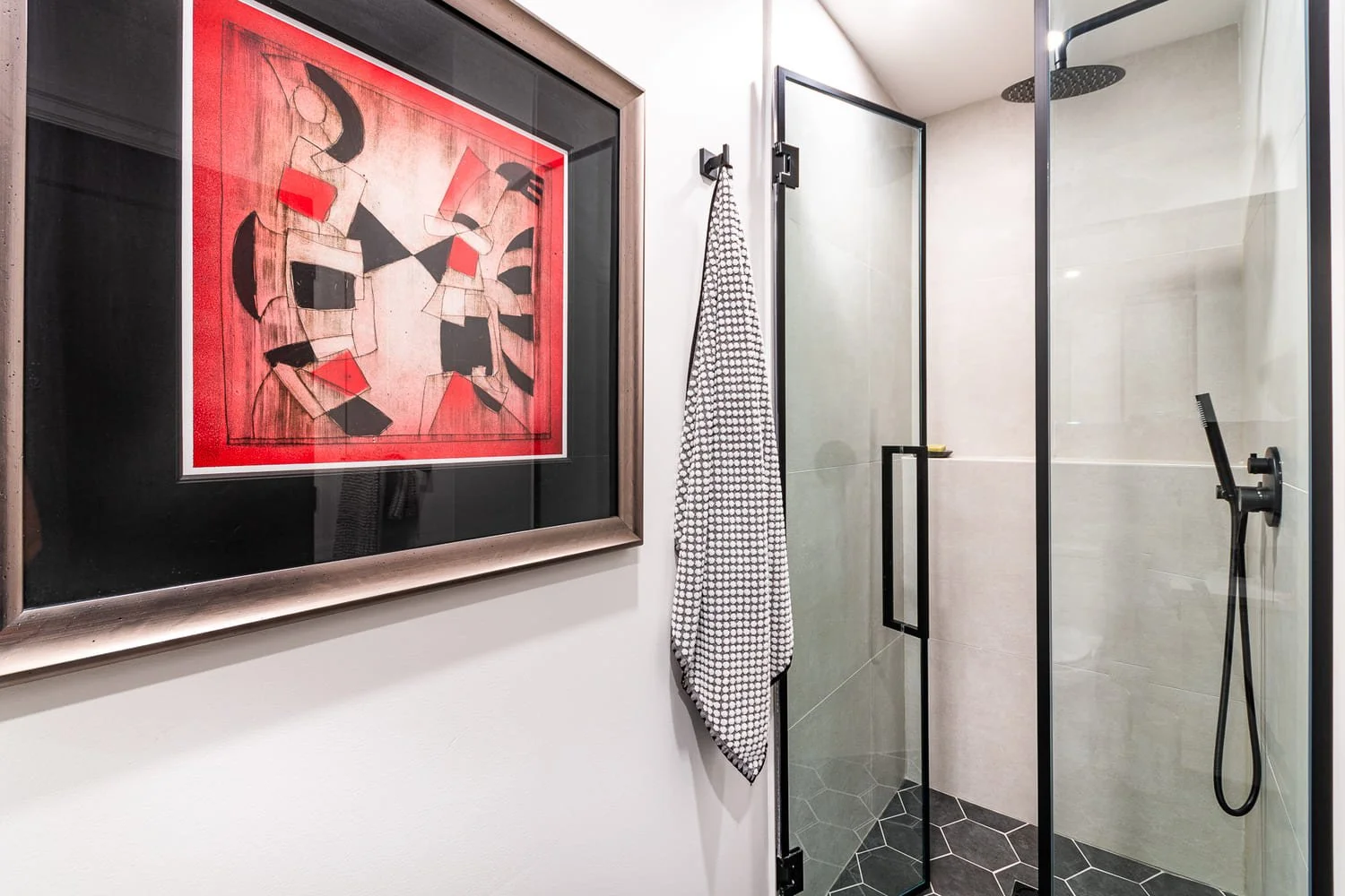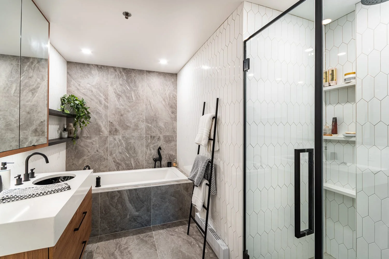 Les salles de bain, rénovées dans la même logique, allient praticité et sophistication : matériaux nobles, carreaux texturés, robinetteries noires et bois naturel créent des atmosphères à la fois calmes et structurées.