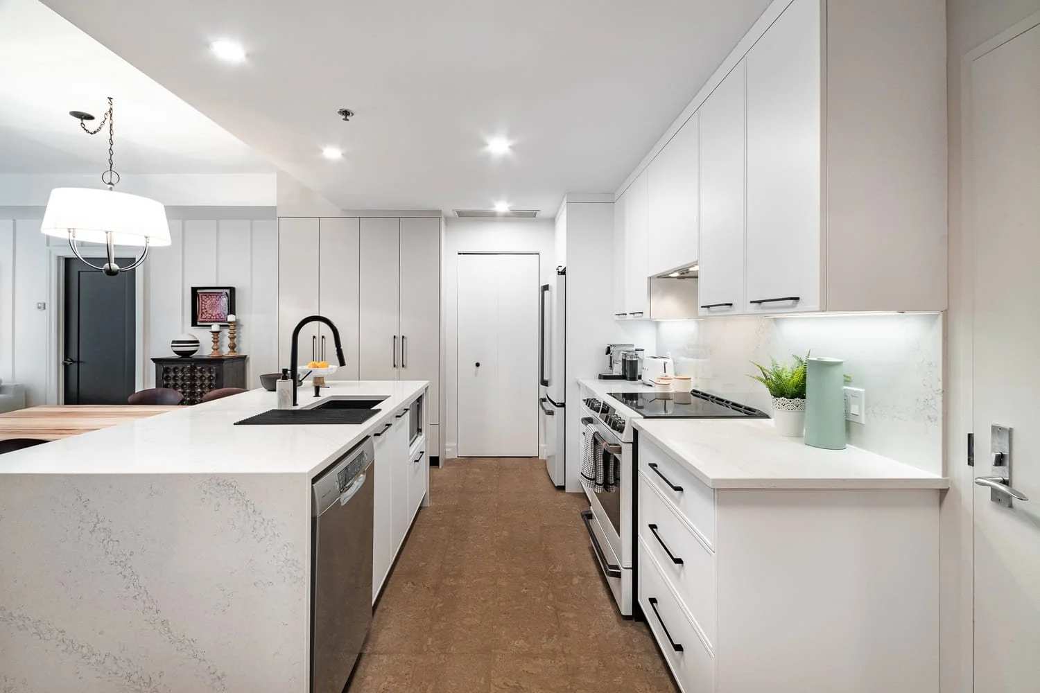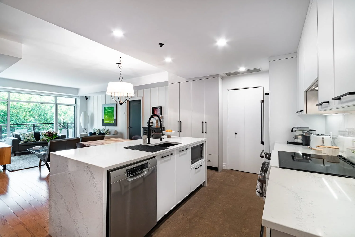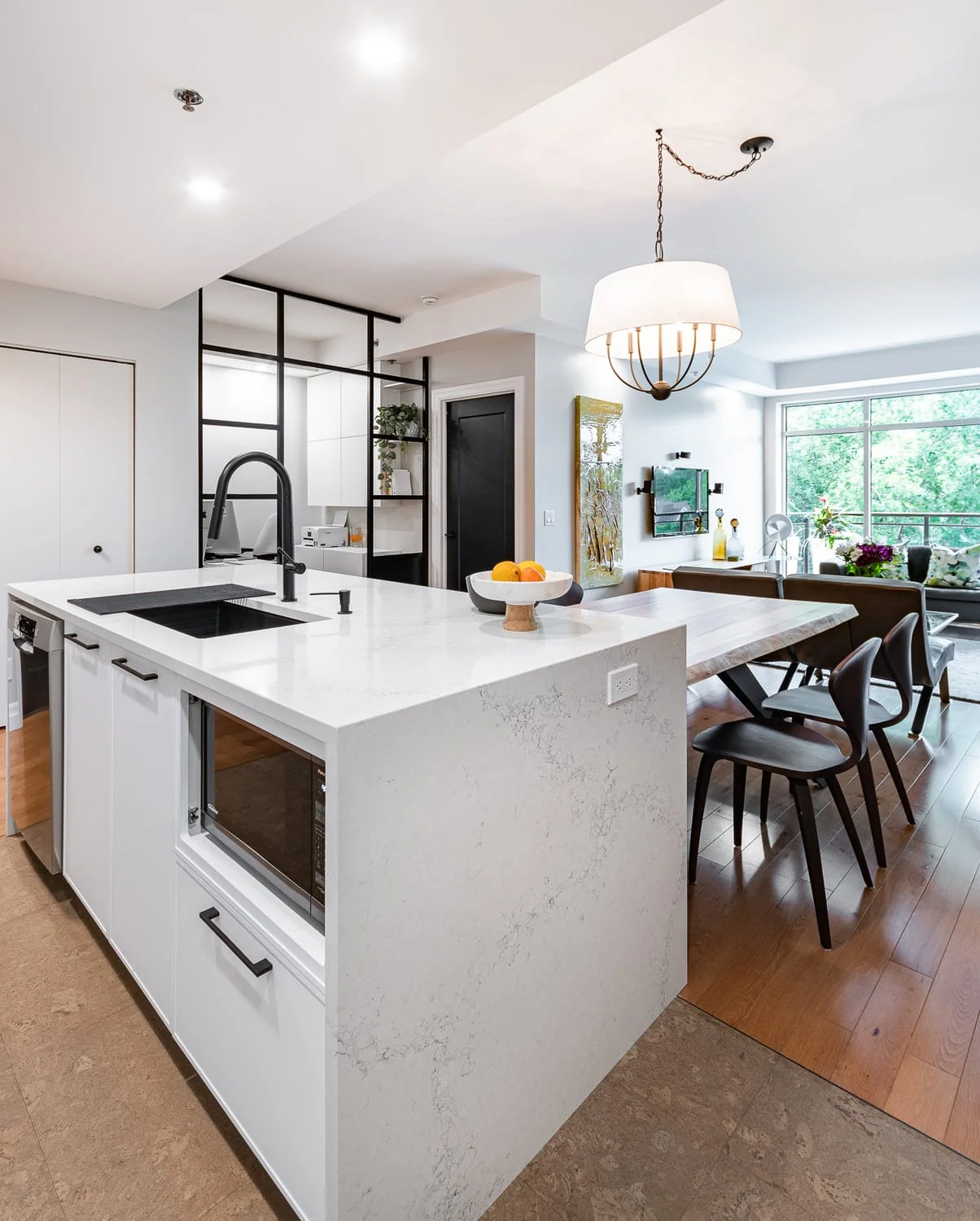 La cuisine, minimaliste et élégante, mise sur des armoires blanches pleine hauteur, un îlot en quartz à retombée, et des accents noirs mats pour un contraste chic et intemporel.