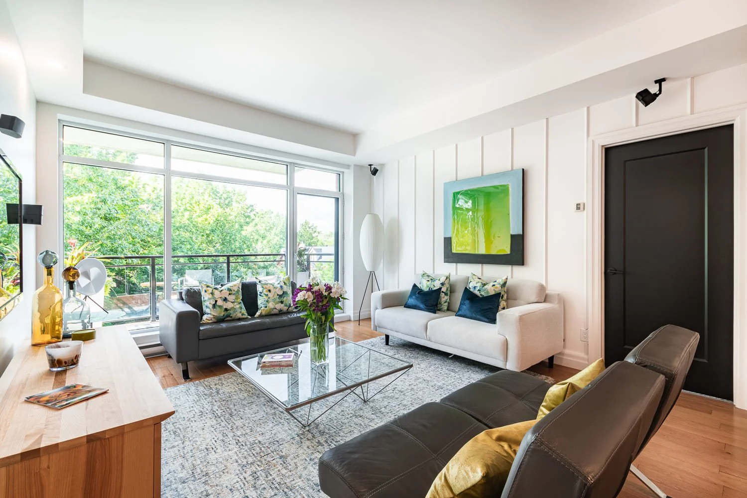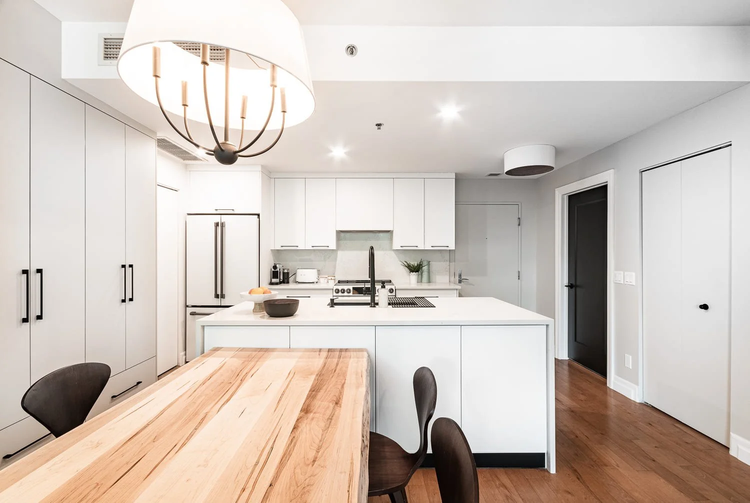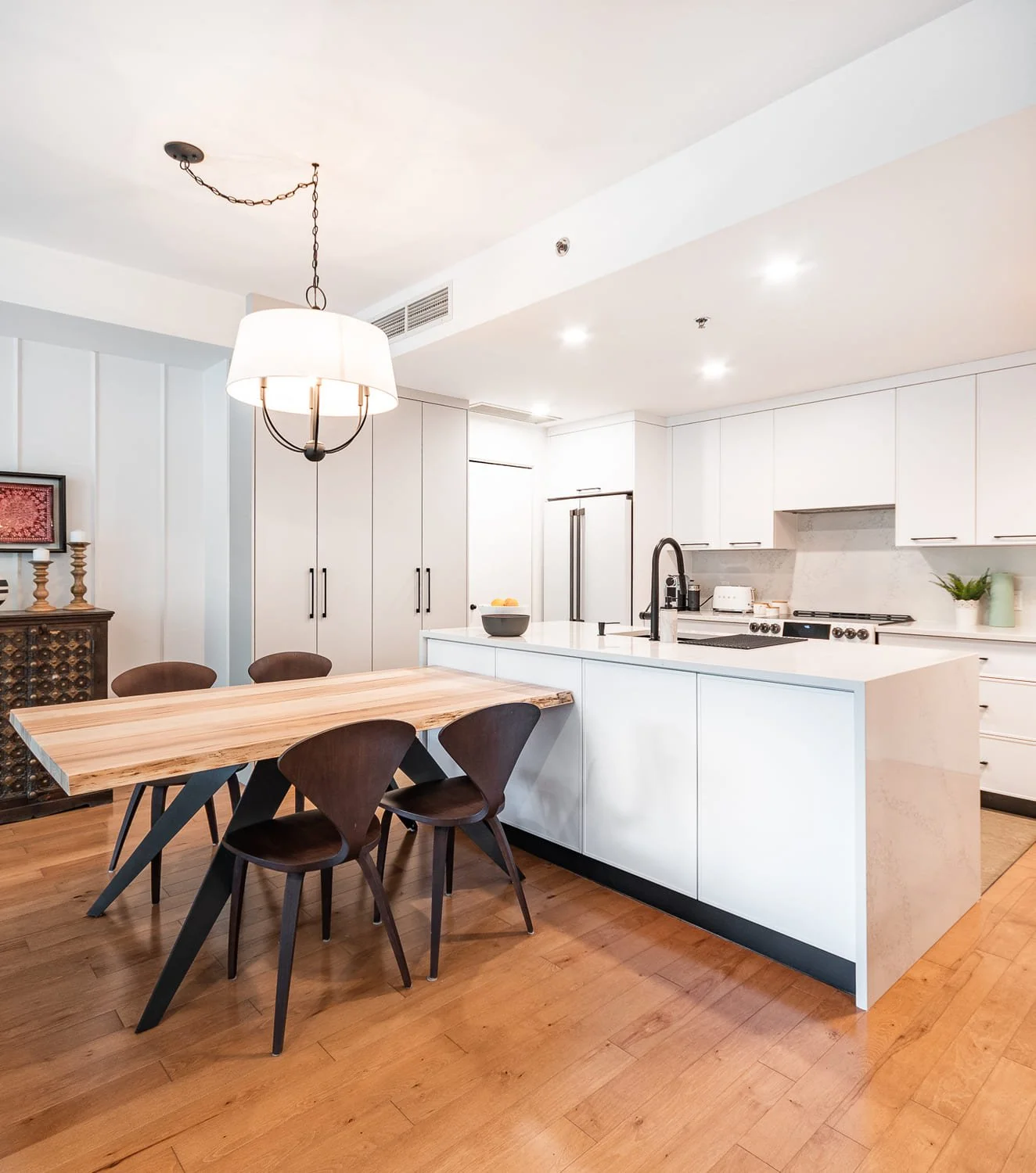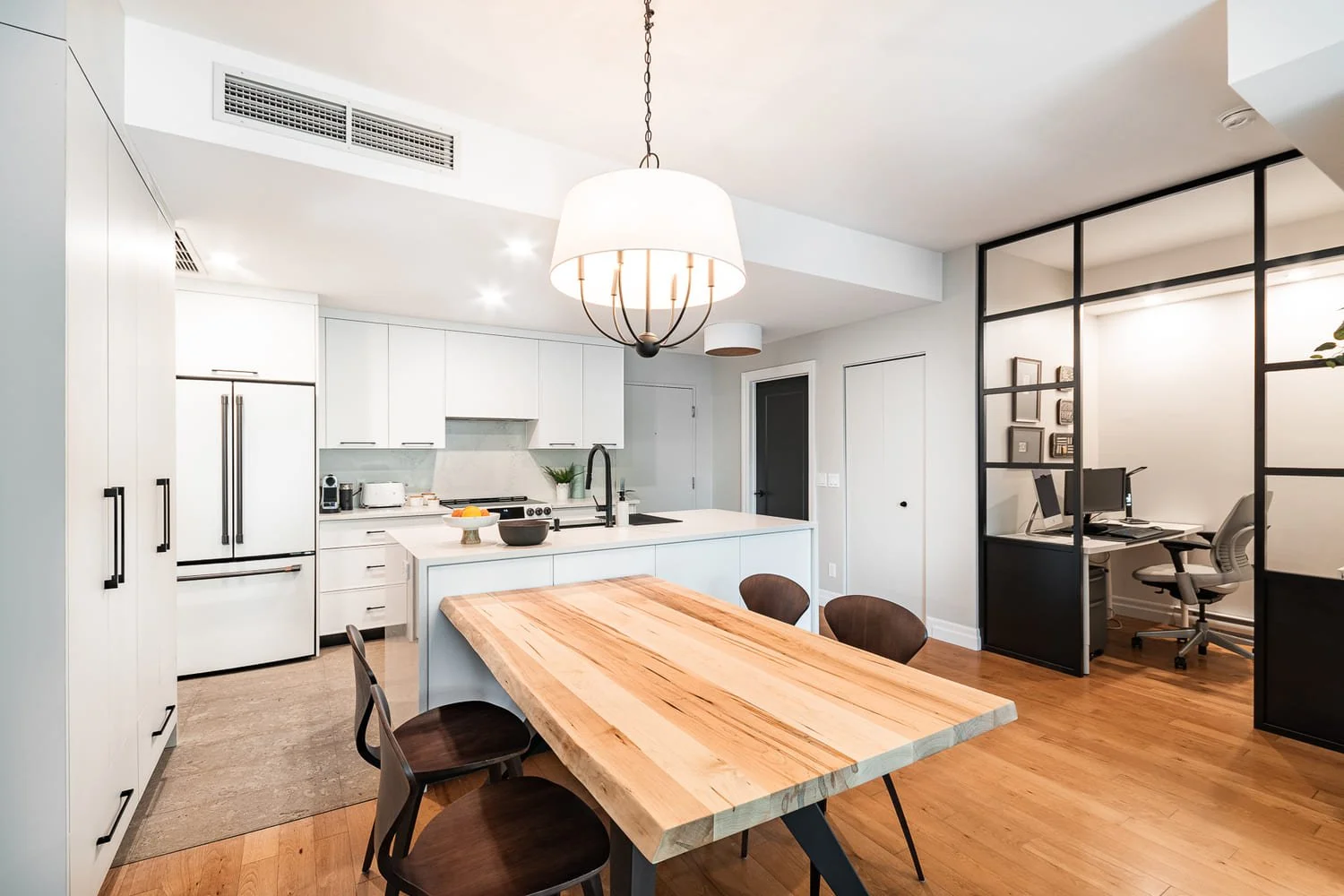 Notre cliente, propriétaire de son condo depuis plusieurs années, souhaitait une rénovation complète qui reflète sa personnalité et ses besoins du quotidien. L’aménagement a été entièrement repensé pour créer une unité fluide entre les espaces de vie : salon, cuisine, salle à manger et bureau.